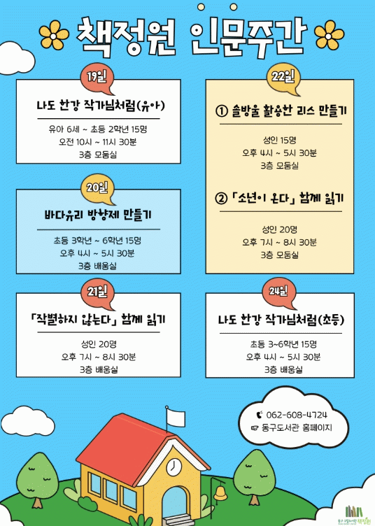 임택 동구청장은 “한강 작가의 노벨문학상 수상 1주년을 기념해 다채로운 프로그램을 마련했다”면서 “인문 체험, 독서 프로그램 등을 경험하면서 인문학적 소양을 쌓길 바란다”고 말했다.