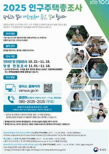 표본으로 선정된 가구에는 이미 조사안내문과 큐알(QR)코드가 포함된 우편물이 발송됐으며, 응답자는 해당 안내문에 기재된 인구주택총조사 누리집접속 또는 스마트폰으로 큐알코드를 인식해 인터넷 조사에 참여할 수 있다.