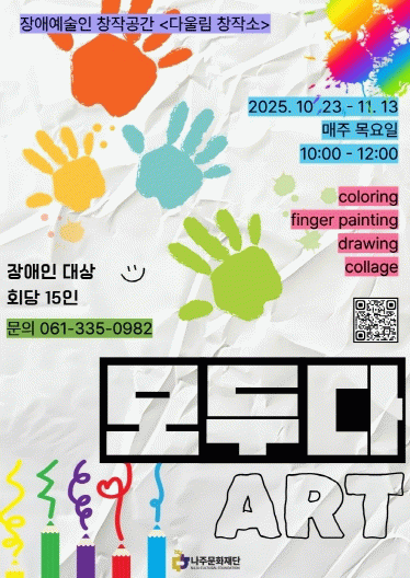 나주문화재단(이사장 윤병태)은 장애 예술인의 자립 기반 마련과 사회적 인식 개선을 목표로 오는 11월 13일까지 매주 목요일 ‘다울림 창작소’에서 미술창작 프로그램 ‘모두다ART’를 진행한다고 30일 밝혔다.