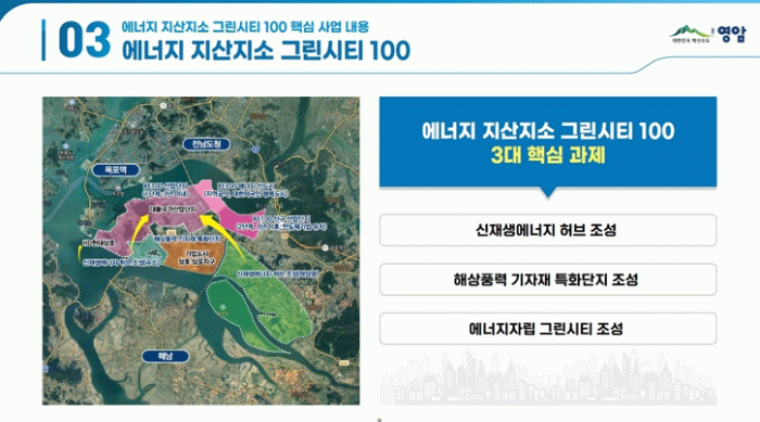 영암군은 대한민국 에너지 대전환을 선도하는 ‘에너지 지산지소 그린시티 100’ 정책을 추진 중이다.
