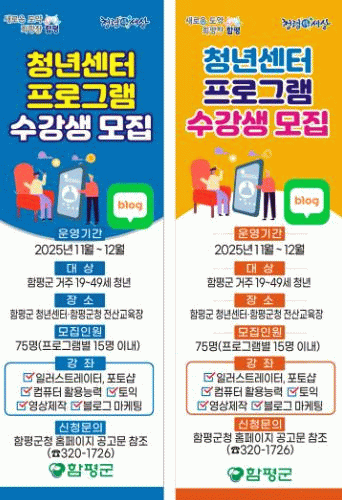 이번 교육은 11월부터 12월까지 운영되며, 함평군에 주소를 둔 만 19세 이상 49세 이하 청년이면 누구나 신청할 수 있다.