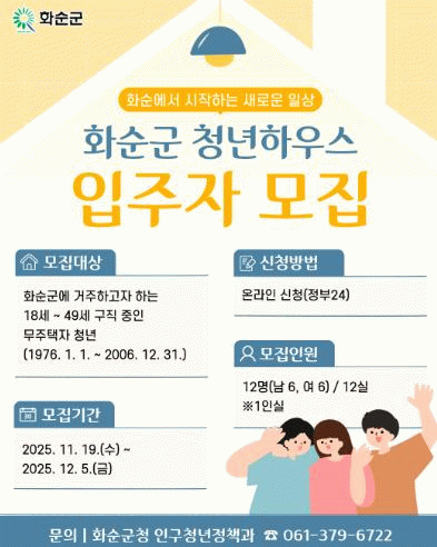 접수는 정부24에 ‘화순군 청년하우스 입주 신청’을 검색해 신청서를 작성하면 된다.