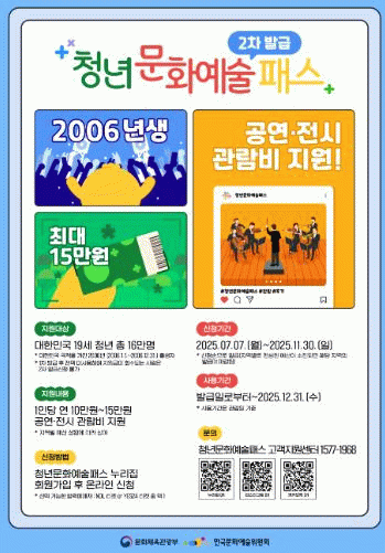‘청년문화예술패스’ 사업은 사회에 첫발을 내딛는 청년들에게 문화예술 향유 기회를 제공하기 위해 예술 분야 공연(연극, 뮤지컬, 클래식, 오페라, 발레, 무용, 합창, 국악 등)과 전시 관람비를 연간 최대 15만 원 지원하는 사업이다.