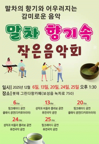 이번 작은 음악회는 겨울철 보성을 찾는 주민과 관광객에게 말차 향과 음악이 어우러진 특별한 휴식을 제공하기 위해 보성군이 기획한 소규모 문화 행사다.