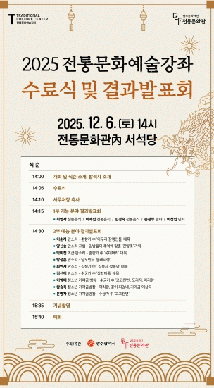 수료식은 상·하반기 수강생 수료증 전달식에 이어 1부 기능분야(탱화, 민화, 전통음식) 발표회, 2부 예능분야(판소리, 판소리고법, 가야금병창) 발표회 순으로 진행된다.