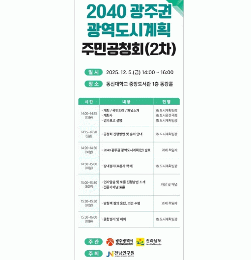 박금화 도시공간국장은 “광주권 광역도시계획은 광주시와 전남도가 동일한 발전전략을 수립, 협력하기 위해 마련하는 지침이다”며 “공청회에서 제시된 시민·전문가들의 의견을 꼼꼼히 계획안에 반영하겠다”고 밝혔다.