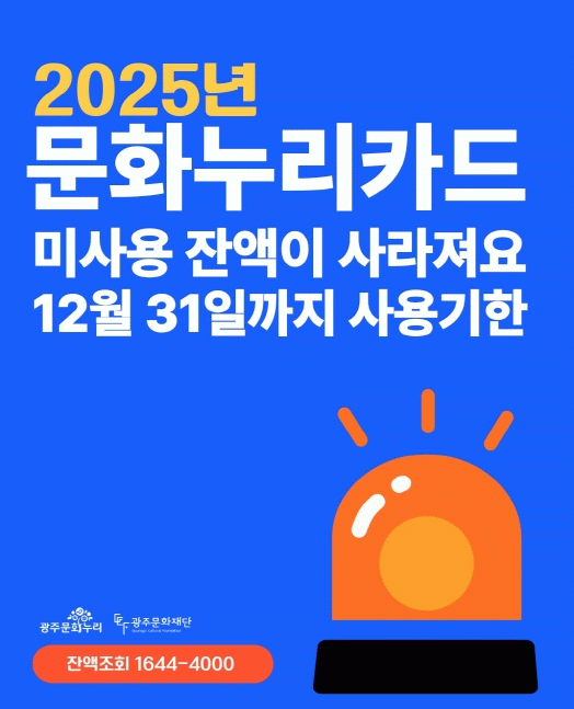 문화누리카드 이용자를 위한 전액소진 이벤트도 진행된다. 올해 지원금을 모두 사용한 뒤 12월 14일까지 인증하면, 총 107명에게 CU 모바일상품권(1만 원권)을 추첨 지급한다. 이벤트 인증은 광주문화누리 카카오톡 채널을 통해 참여할 수 있다.
