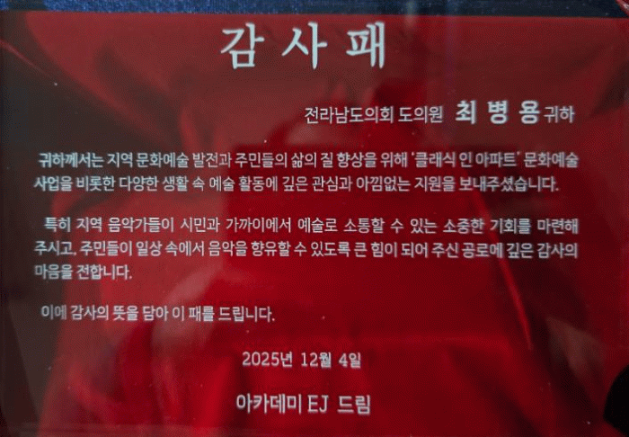 최병용 의원은 “이번 감사패는 척박한 환경에서도 예술혼을 지키는 지역 예술인들과 문화를 사랑하는 여수 시민들이 주신 상이라 더욱 뜻깊다”라고 소감을 전하며, “앞으로도 주민들이 집 문을 열면 바로 문화예술을 만날 수 있도록 ‘문화가 흐르는 전남’을 만들기 위해 최선을 다하겠다”라고 의지를 밝혔다.