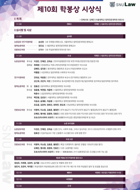 제10회 학봉상 시상식은 지난 12월 3일 오전 11시, 서울대학교 호암교수회관 목련홀에서 개최됐다. 이번 수상작은 서울대학교 법학전문대학원 학봉상 공식 홈페이지를 통해 확인할 수 있다.