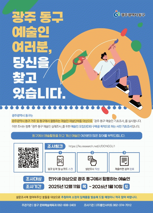 지난 11일 시작한 이번 조사는 향후 추진할 ‘광주 동구 예술인 실태조사’를 위한 예술인 모집단을 구축하기 위한 사전 기초조사로, 동구 예술인 전체를 대상으로 기본 현황을 파악하는 데 목적이 있다.