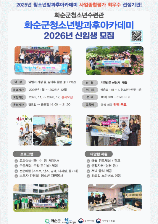서봉섭 가족정책실장은 “돌봄이 필요한 청소년들이 방과 후 체험활동과 다양한 프로그램을 제공하여 참여 청소년들이 전인적으로 성장할 수 있도록 적극 지원하는 화순군 청소년방과후아카데미가 될 수 있도록 노력하겠다”라고 말했다.