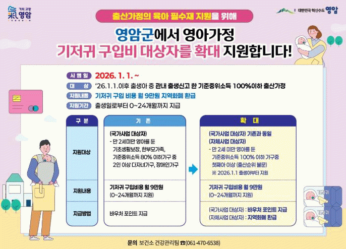 박수희 영암군보건소장은 “영아 양육 과정에서 발생하는 기저귀 비용은 가정에 실질적인 부담으로 작용하고 있다. 이번 지원 확대가 출산 가정의 경제적 부담을 덜고, 아이 키우기 좋은 영암을 만드는 데 기여하길 바란다”고 말했다.