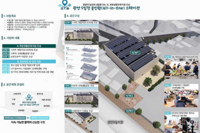 ‘광양읍 오일장 올인원 스테이션’ 사업은 광양읍 원도심에 주차·커뮤니티·청년창업·문화 기능을 결합한 복합커뮤니티 타워를 조성하는 도시재생 사업으로, 해당 지역의 상권 활성화와 주민 삶의 질 개선을 목표로 한다.