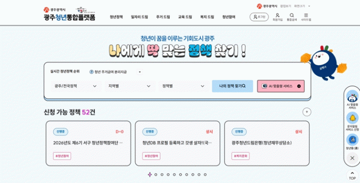 광주청년통합플랫폼은 일자리·주거·교육·복지문화 등 다양한 청년정책 정보를 인공지능(AI) 맞춤형 서비스로 제공하고, 정책 검색부터 신청까지 원스톱으로 가능하도록 개편한 것이 특징이다.