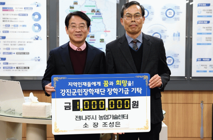 박태준 한국농어촌공사 강진지사 지사장이 2백만 원, 윤준호 전남문화관광해설사협회 강진군지회 윤준호 회장, 조성은 전(前) 나주시 농업기술센터 소장, 조인석 군동 남미륵사 풍요로운 편의점 대표, 김병림 도암면 이장단 단장, 김한춘 플랜엔지니어링(주) 대표가 각 1백만 원의 장학금을 강진군민장학재단(강진원)에 기탁 했다.