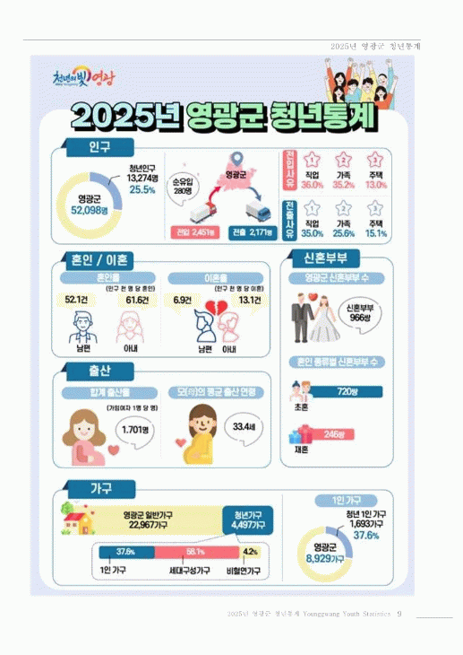 군은 지난 2024년 기준 영광군에 주소를 둔 18세 이상 45세 이하의 청년을 대상으로 통계를 작성했으며, 인구‧가구, 경제, 일자리, 창업, 복지, 건강 6개 부문 59개 항목으로 구성된다.