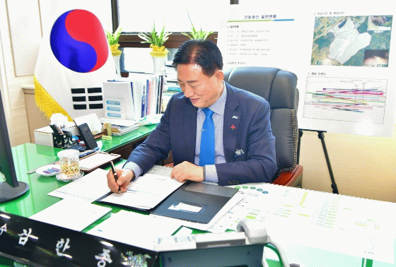 군에 따르면 2일 김한종 군수가 집무실에서 해당 서한문에 서명하며, 건동광산 개발에 대한 군의 추진 의지를 재확인했다.