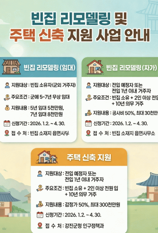 자세한 내용은 강진군청 인구정책과 주거지원팀 또는 각 읍·면사무소로 문의하면 된다.