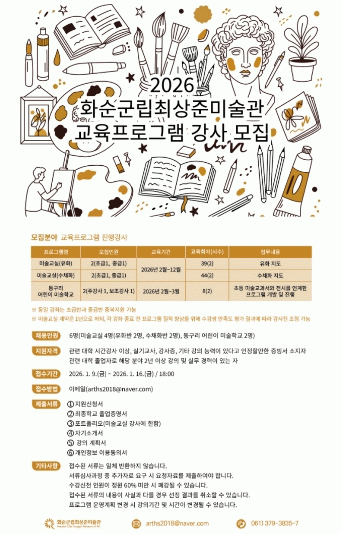 접수 방법은 화순군립최상준미술관 누리집 공지 사항에서 제출 서류 양식을 내려받아 작성 후 방문 또는 이메일로 접수하면 된다. 기타 문의 사항은 화순군립최상준미술관에 문의하면 된다.