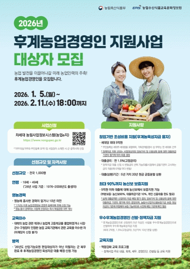 군 관계자는 “이번 후계농업경영인 육성사업은 젊고 유능한 인재들이 안정적으로 농업을 시작하고 성장할 수 있는 중요한 기회”라며, “미래 농업을 이끌어갈 예비 농업인들의 많은 관심과 참여를 바란다”고 말했다.