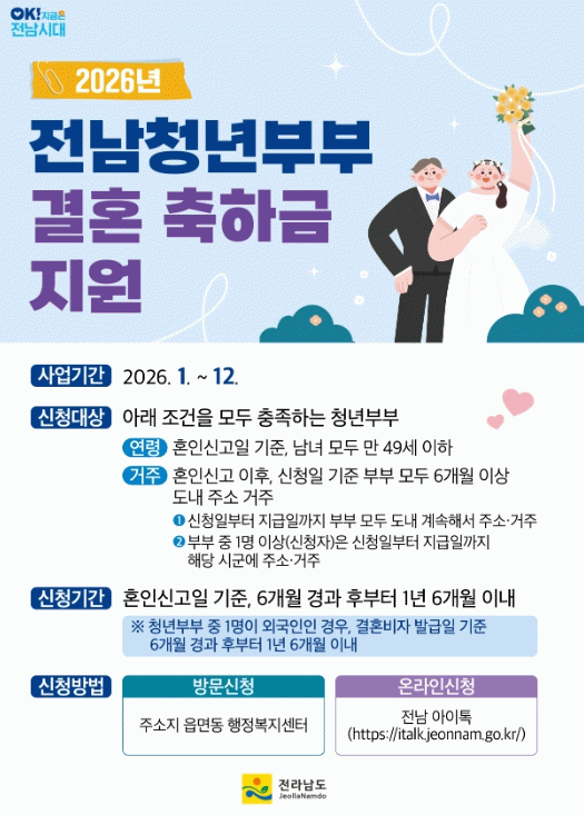 결혼축하금은 주소지 관할 읍면동 행정복지센터를 방문해 신청하거나 전남 아이톡에서 온라인으로 접수하면 된다.