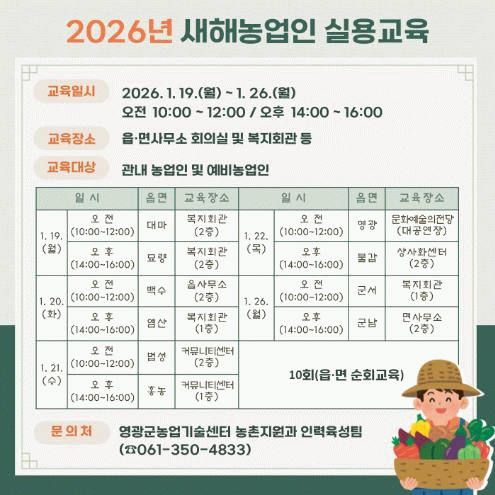 ▲영광읍 – 1. 22. 10:00 영광문화예술의전당 대공연장 ▲백수읍 – 1. 20. 10:00 읍사무소 2층 ▲홍농읍 – 1. 21. 14:00 커뮤니티센터 1층 ▲대마면 – 1. 19. 10:00 복지회관 2층 ▲묘량면 – 1. 19. 14:00 복지회관 2층 ▲불갑면 – 1. 22. 14:00 상사화센터 2층(불갑면사무소 옆 신축건물) ▲군서면 – 1. 26. 10:00 복지회관 1층 ▲군남면 – 1. 26. 14:00 면사무소(2층) ▲염산면 – 1. 20. 14:00 복지회관 1층 ▲법성면 – 1. 21. 10:00 커뮤니티센터 2층