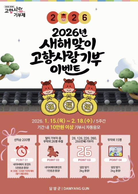 이번 이벤트는 행사 기간 중 담양군에 10만 원 이상 기부하면 자동 응모되는 방식으로 진행되며, 참여자에게는 추첨을 통해 네이버페이 포인트와 담양 딸기가 경품으로 제공된다.