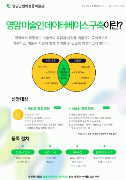 이 사업은 영암 출신이거나 영암에서 활동 이력이 있는 미술인들을 △전공 △주요 창작 경력 △작업 환경 등으로 분류해 데이터베이스를 구축하고, 미술관 교육·체험 프로그램, 전시, 홍보 등에 활용하기 위한 것.