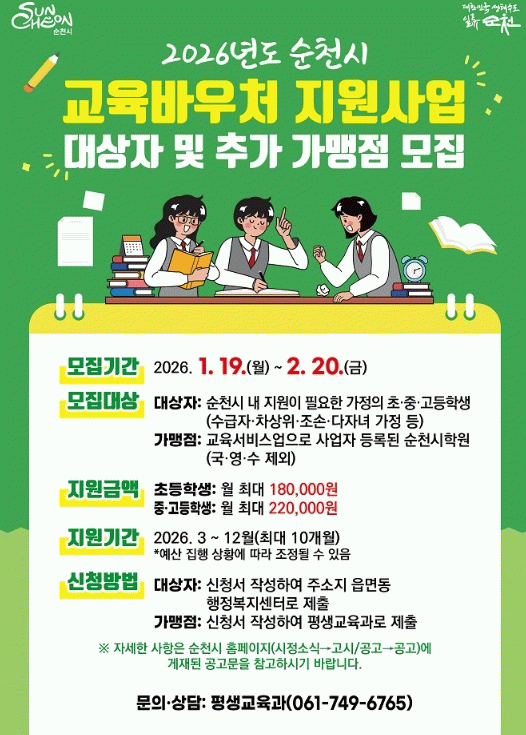 시 관계자는 “순천시 교육바우처 지원 사업으로 가정형편이 어려운 학생들이 교육비 걱정을 덜고 배움의 기회를 넓히는 데 도움이 되기를 바란다”며, “앞으로도 누구나 공평하게 교육받을 수 있는 순천시를 만드는 데 최선을 다하겠다”고 전했다.