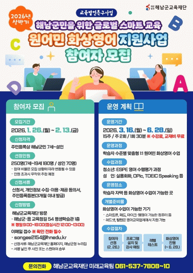군 관계자는 “군민 누구나 언어의 울타리를 넘어 세계와 소통하며 글로벌 역량을 함양하는데 실질적인 도움을 받기를 기대한다”며“특히 청소년들이 미래를 이끌어갈 글로벌 리더로서 성장하는 든든한 밑거름이 될 수 있도록, 군민 여러분의 많은 관심과 참여를 부탁드린다”고 전했다.