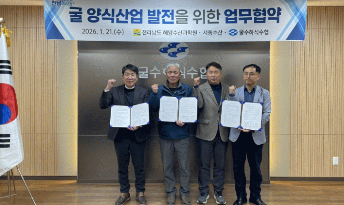 이번 업무협약은 최근 고수온, 빈산소수괴 등 이상해황으로 인해 자연채묘는 불안정하고 작황부진이 반복적으로 발생함에 따라 여수 가막만 해역에 적합한 2·3배체 인공종자 현장 적용을 통해 안정적이고 지속가능한 굴 생산 기반을 구축하기 위해 진행됐다.