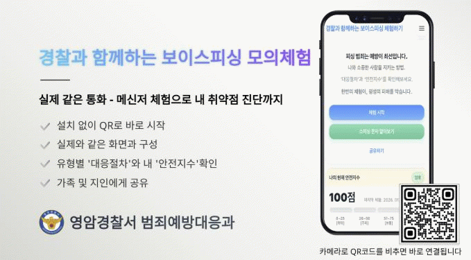 ‘보이스피싱 체험하기’ 어플은 별도 설치 없이 QR로 즉시 접속해 실제, 통화·메신저 화면 흐름을 따라가는 상황 전개형 시나리오로 구성됐다.