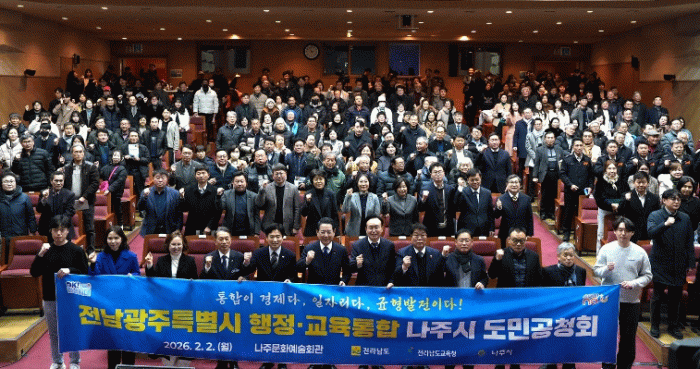 나주시는 2일 나주문화예술회관에서 전라남도와 함께 ‘전남·광주 행정·교육통합 나주시 도민공청회’를 개최하고 통합에 따른 지역 발전 방안과 시민 의견을 청취했다고 밝혔다.
