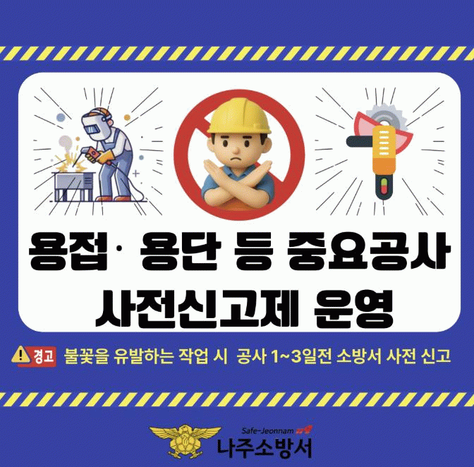 신향식 나주서장은 “용접 등 불꽃 작업은 작은 부주의로도 대형화재로 확산될 수 있는 고위험 작업”이라며“사전 신고를 통해 소방관서와 정보를 공유하면 화재 예방 효과가 큰 만큼 관계자들의 적극적인 협조를 당부드린다”고 말했다.