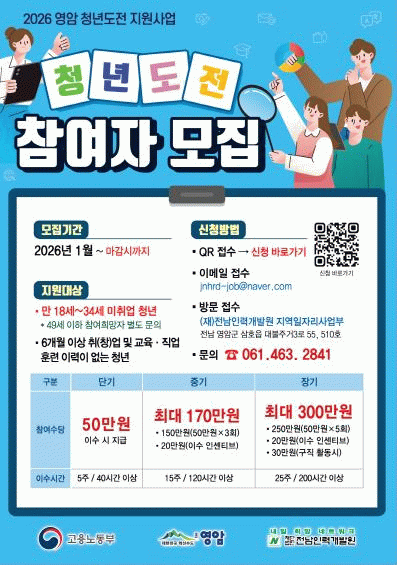 고용노동부의 청년 도전 지원사업 공모에 3년 연속 선정된 영암군은, 이번 사업으로 구직 단념 청년의 자신감 회복, 취업 동기 고취를 위해 밀착 상담, 진로 탐색 등을 지원한다.
