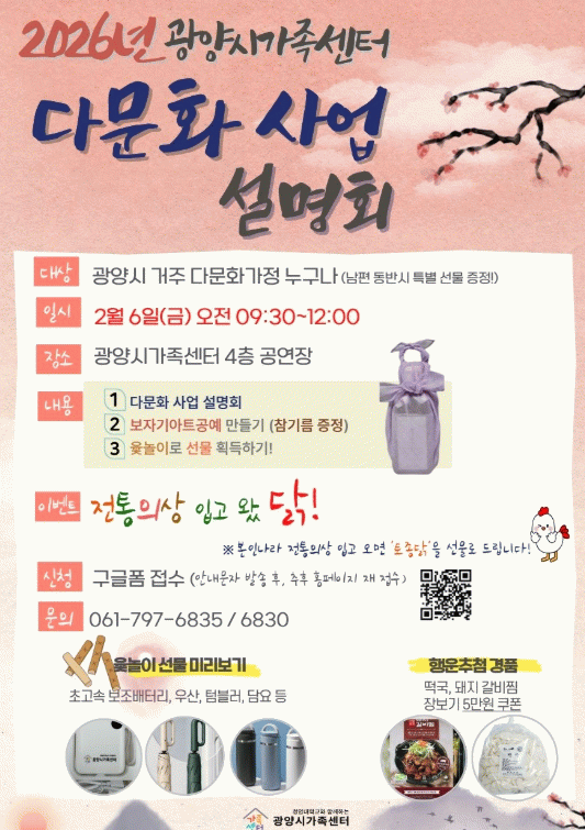 광양시가족센터 이주화 센터장은 “이번 설명회가 다문화가족에게 센터의 다양한 사업을 알리는 동시에, 설 명절을 앞두고 따뜻한 교류의 시간이 되기를 바란다”며 “많은 다문화가족의 관심과 참여를 기대한다”고 밝혔다.