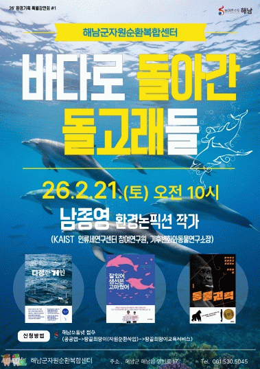이번 강연에서는 2009년 제주도에서 불법 포획돼 서울대공원에서 돌고래쇼에 동원되다가 2013년 다시 고향 바다로 돌아간 제돌이를 비롯해 춘삼이, 삼팔이 등 실제 방사 사례를 중심으로 돌고래들이 다시 바다로 돌아가기까지의 준비 과정과 그 사회적 의미를 전달할 예정이다.