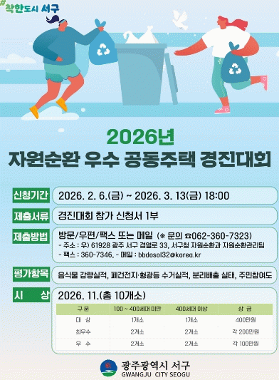 이판구 자원순환과장은 “자원순환 우수 공동주택 경진대회를 통해 주민 참여를 기반으로 자원순환 실천 문화가 지속적으로 확산될 수 있도록 노력하겠다”고 말했다.