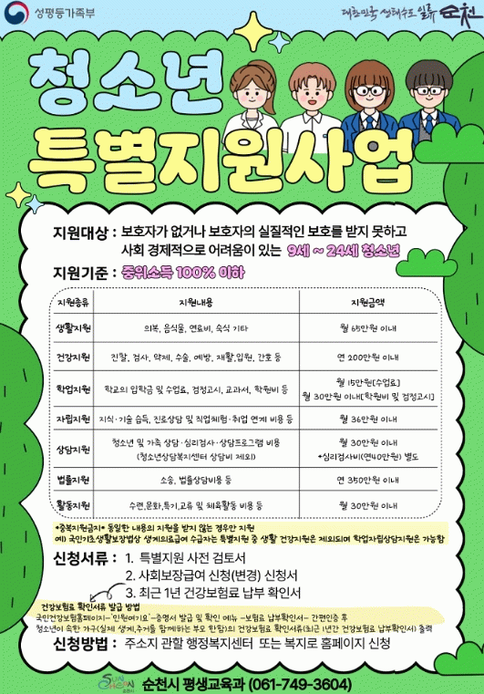 지원 내용은 생활·건강·학업·자립·상담·법률·활동 지원 등이며, 지원 기준은 가구의 중위소득 100% 이하인 청소년이다.