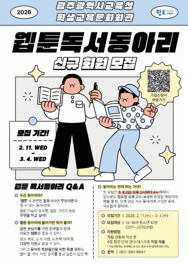 ‘웹툰 독서동아리’는 성황리에 운영 중인 겨울방학 강좌 ‘글빛 항해단: 웹툰 작가’를 통해 확인된 청소년들의 웹툰에 대한 뜨거운 관심과 열기를 반영하여 청소년들이 더욱 다양한 웹툰 관련 활동을 주도적으로 추진할 수 있도록 마련됐다.
