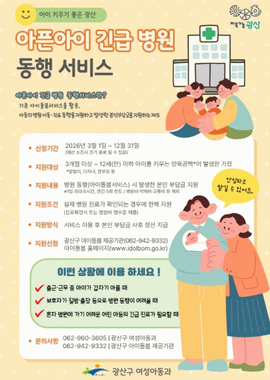 광산구 관계자는 “출근길 아이가 갑자기 열이 날 때 부모님이 느끼는 막막함을 해소하는 것이 이번 사업의 핵심”이라며 “부모가 안심하고 믿을 수 있는 촘촘한 돌봄 체계로 아동의 적기 진료와 건강 회복을 밀착해 지원하며, 가정의 양육 부담도 덜어드리겠다”라고 말했다.