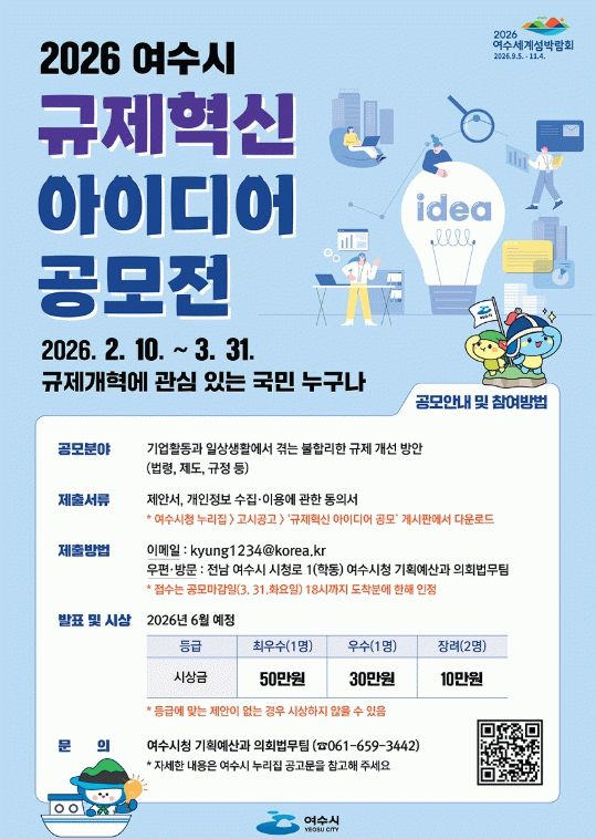 접수된 제안은 1차 소관부서 검토를 거친 뒤 여수시 규제개혁위원회에서 평가 기준에 따라 심사하여 6월 중 수상자를 발표할 예정이다.
