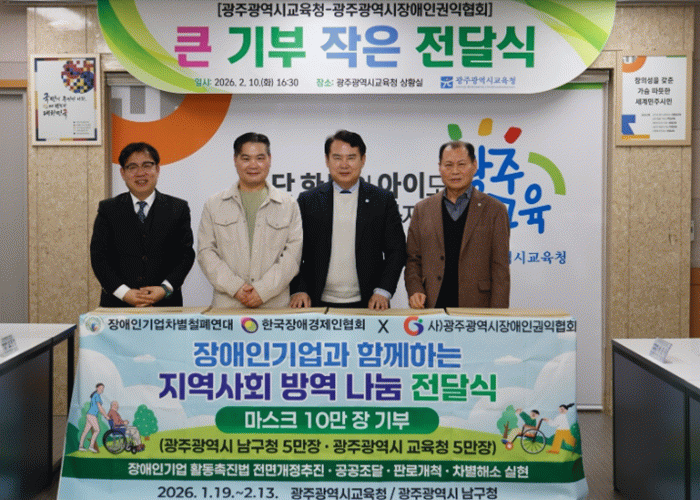 광주시장애인권익협회 김선욱 회장은 “이번 기부가 학생들의 건강을 지키는 데 작은 힘이 되길 바란다”며 “지역사회와 함께하는 나눔 활동을 꾸준히 펼치겠다”고 전했다.