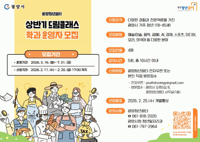 한편, 드림클래스 운영자 모집과 관련한 자세한 사항은 광양청년꿈터 누리집 또는 전화 문의를 통해 확인할 수 있다.