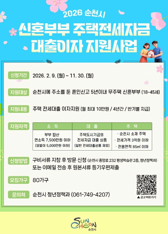 신혼부부 주택전세자금 대출이자 지원사업은 순천시에 거주하는 무주택 신혼부부에게 전세자금 대출이자를 월 10만 원씩 최대 4년간 지원하는 사업이다.