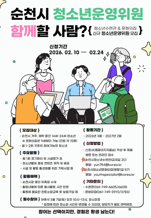모집은 2월 24일까지 순천시에 거주하거나 관내 재학 중인 9세~24세 청소년을 대상으로 하며, 자세한 사항은 각 시설 누리집 및 순천시청소년수련관 또는 문화의 집을 통해 안내받을 수 있다.