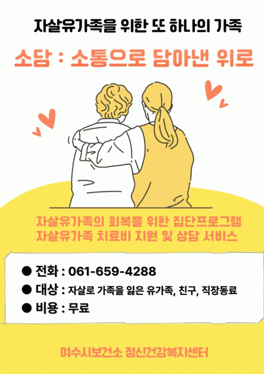 자세한 사항은 여수시보건소(학동) 정신건강복지센터로 문의하면 안내받을 수 있다.