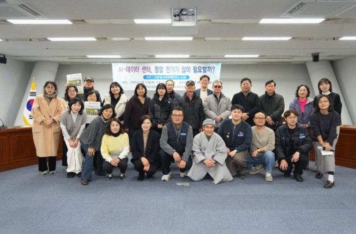 이날 강연을 맡은 김병권 녹색전환연구소 소장은 “세종 네이버 데이터센터 ‘각세종’은 최대 270메가와트 규모로 20~30만 가구 전력 사용량과 맞먹는다”며 “이처럼 AI는 대규모 전력을 소비하는 에너지 집약 산업”이라고 설명했다. 이어 ‘독일과 아일랜드처럼 재생에너지 사용을 의무화하고 기후 완화와 기후 적응을 위한 AI 활용이 필요하다”고 밝혔다.