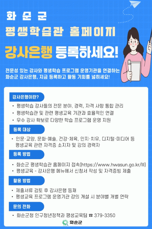 ‘강사은행’ 등록과 관련한 자세한 사항은 화순군청 인구청년정책과 평생교육팀으로 문의하면 된다.