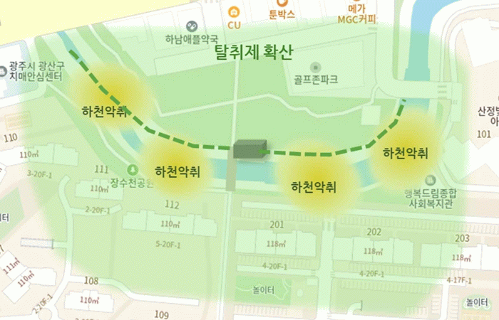 이에 광산구는 악취 해결을 위해 장수천 보도교 하부에 위치한 토구에 악취차단수문 1개소를 설치해 토구에서 배출되는 근본적인 복합악취를 차단하고, 장수천 산책로를 따라 대기편승 악취저감시설 1개소도 설치해 대기 중에 노출된 악취 농도를 줄일 계획이다.